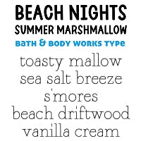 | beach nights type : toasty mallow • sea salt breeze • s'mores • beach driftwood • vanilla cream - inspired by b&bw |